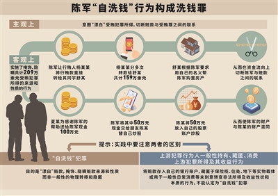 2021年3月1日生效的《刑法修正案(十一)》对洗钱罪作了修改,明确将“自洗钱”入罪,即上游犯罪分子实施犯罪后,掩饰、隐瞒犯罪所得来源和性质的,不再作为后续处理赃款的行为被上游犯罪吸收,而是单独构成洗钱罪。并列举了五种洗钱罪的行为样态:提供资金账户的;将财产转换为现金、金融票据、有价证券的;通过转账或者其他支付结算方式转移资金的;跨境转移资产的;以其他方法掩饰、隐瞒犯罪所得及其收益的来源和性质的。而陈军的相关行为符合对“自洗钱”的认定。